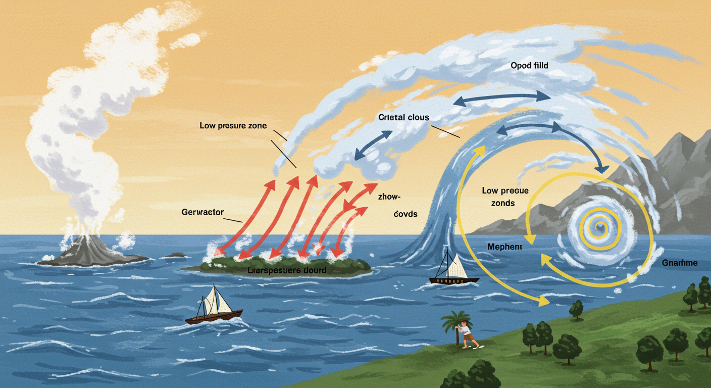 먼 바다에서 따뜻한 해수면과 습한 공기, 초기 저기압성 순환이 결합하면 약한 구름군이 생겨납니다. 이 구름들이 계속 수증기를 공급받고 상층 상승기류를 만나 점점 더 강한 저기압으로 발달합니다.